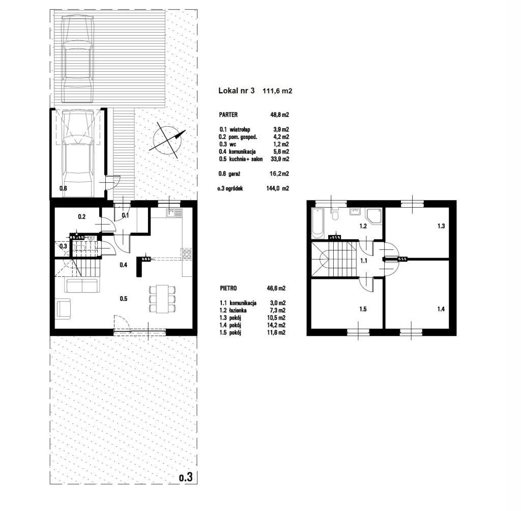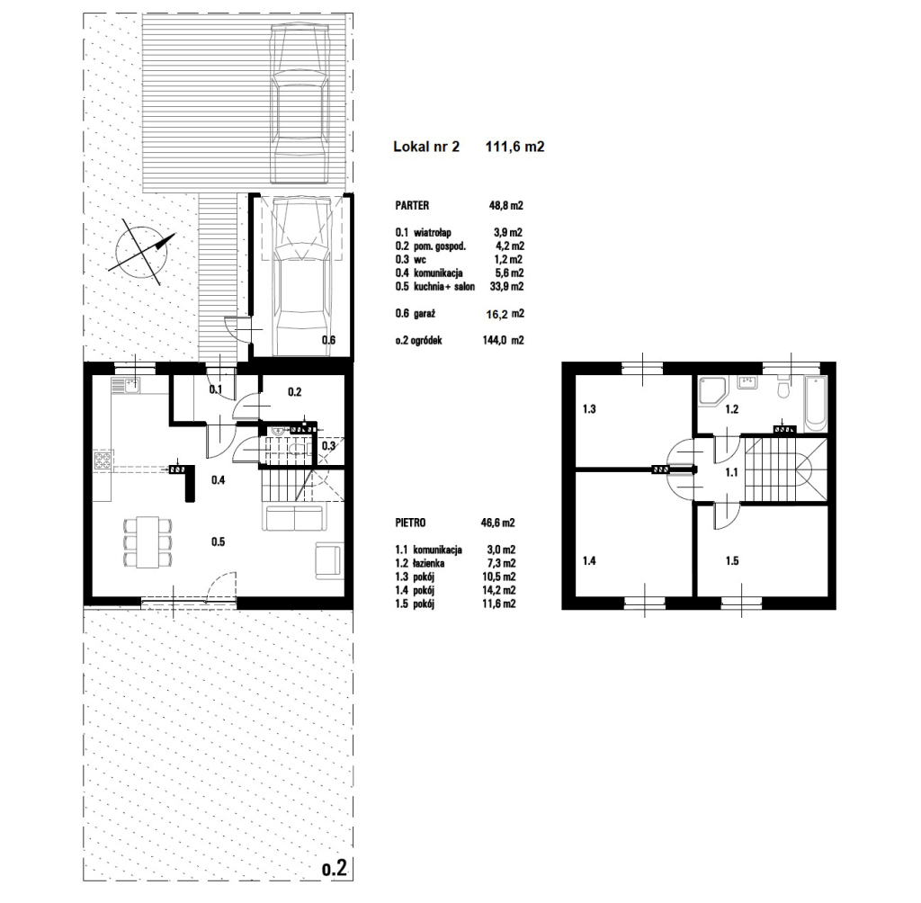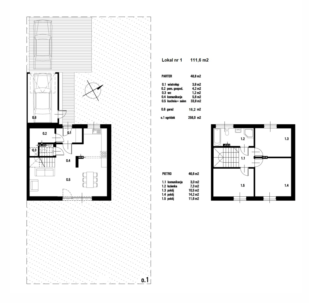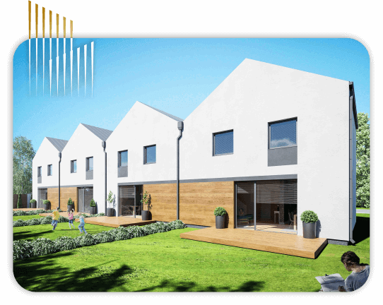 Na zabudowę składają się 4 domy szeregowe o powierzchni około 111 m2, każdy z garażem jednostanowiskowym i ogródkiem, wraz z kompleksowym zagospodarowaniem terenu.