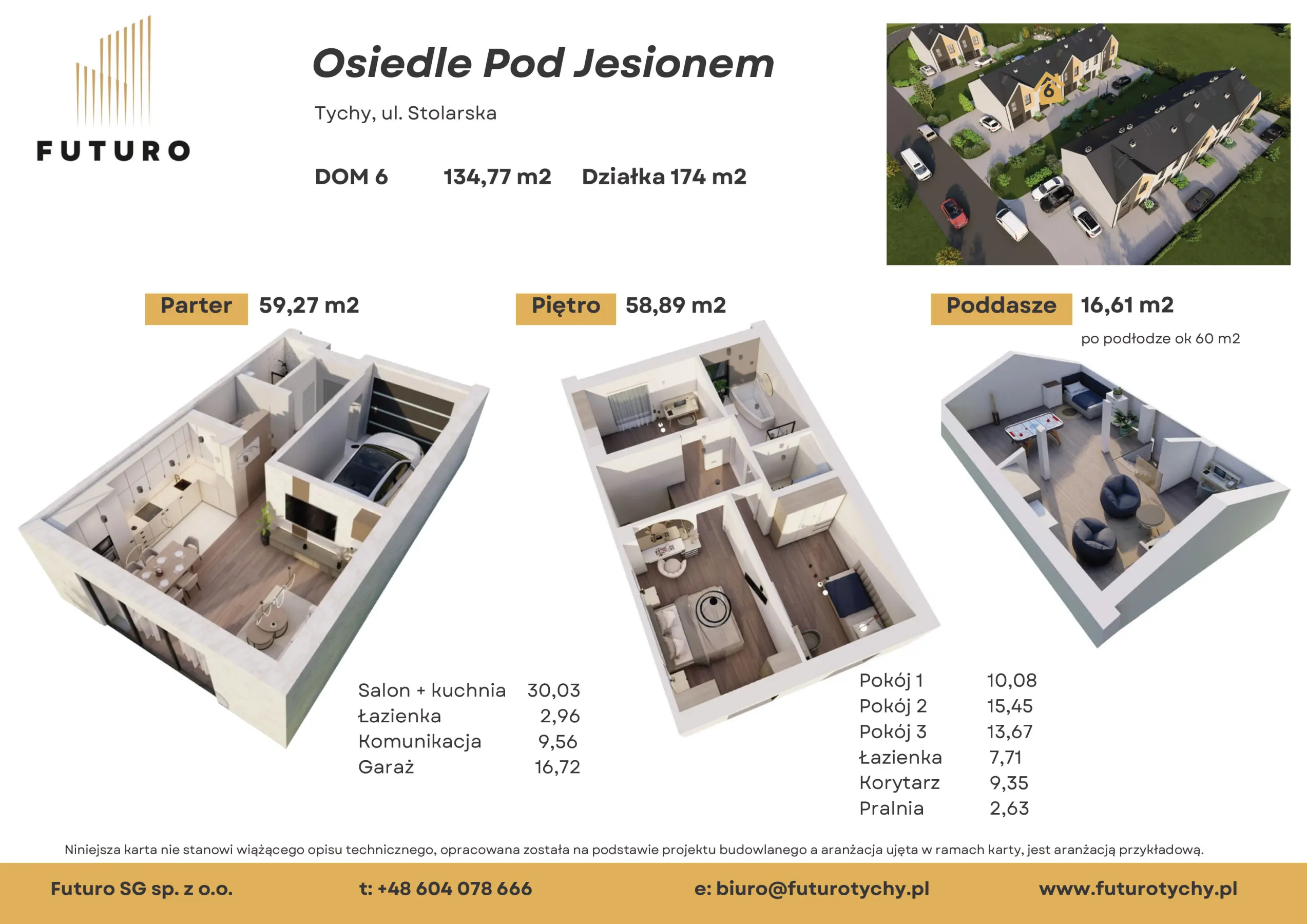 Wszystkie domy majÄ identyczny ukĆad parteru i piÄtra, rĂłĆŒniÄ siÄ wielkoĆciÄ poddasza. Na 135m2 powierzchni uĆŒytkowej mieĆci siÄ przestronny salon z aneksem kuchennym, z duĆŒym panoramicznym oknem tarasowym, 3 sypialnie, dwie Ćazienki, pralnia, garaĆŒ i duĆŒe, poddasze, do wĆasnej aranĆŒacji. SÄ to uĆŒytkowe poddasza, z oknami dachowymi, z przygotowanÄ instalacjÄ elektrycznÄ i przewodami oĆwietleniowymi a ich powierzchnia po podĆodze ma ponad 55m2.